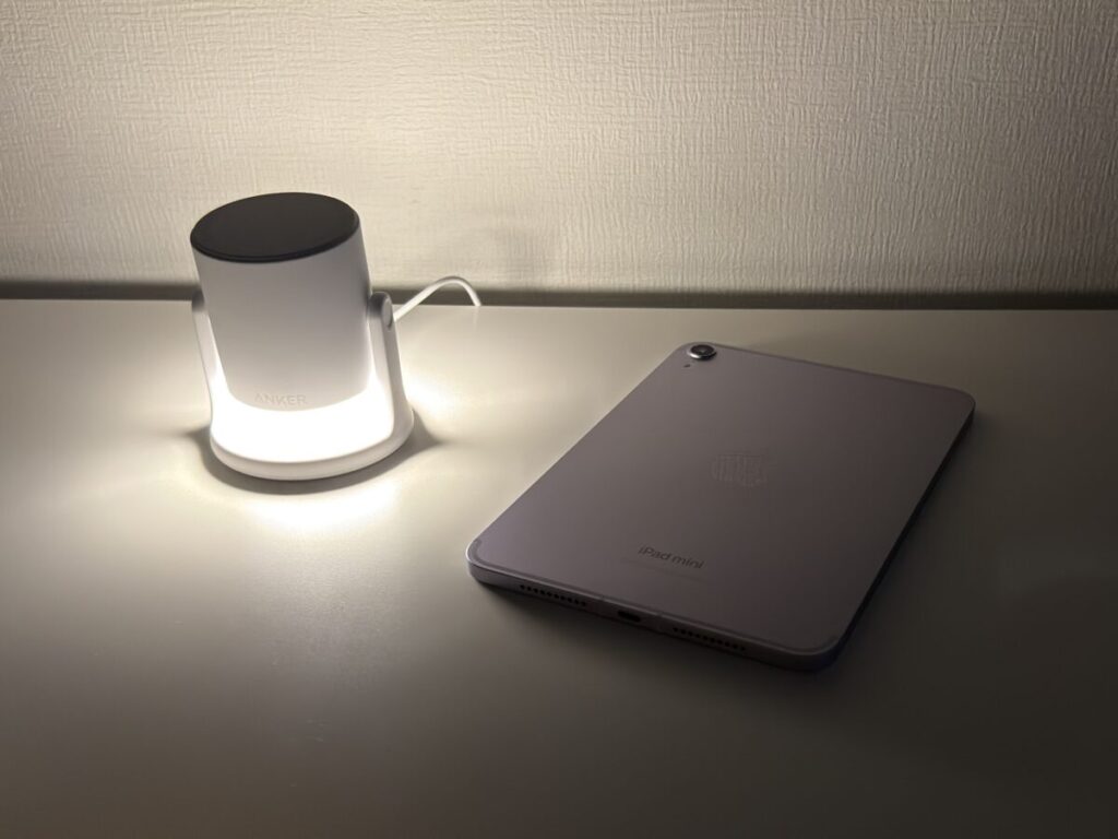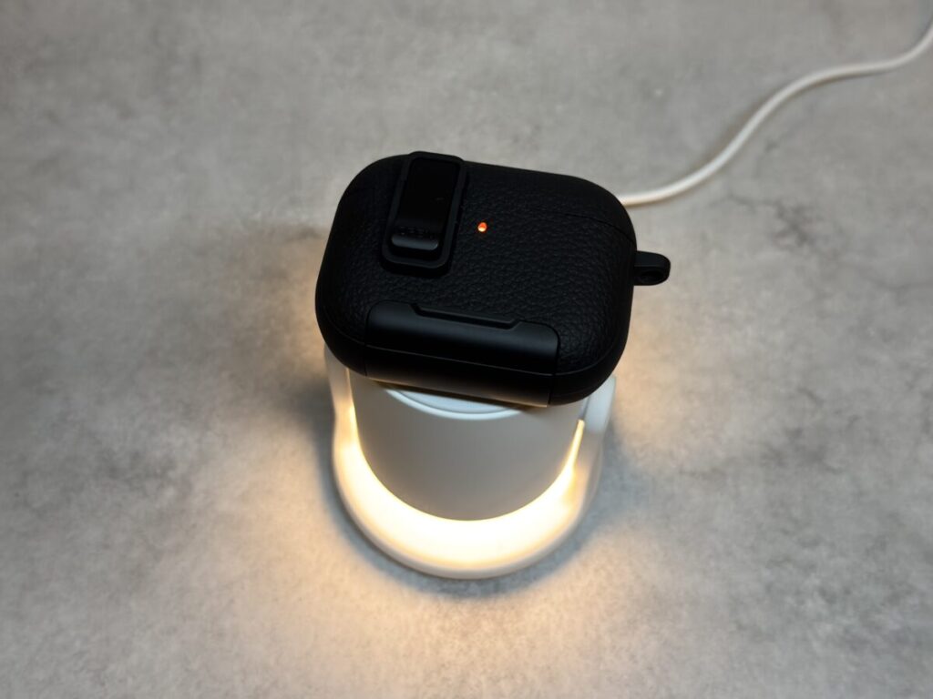 デスクの上でライトを点けながらAirPodsを充電しておけるのはかなり快適です。