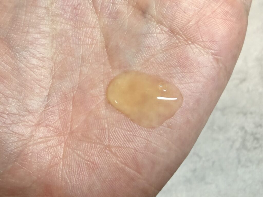 最初に手に取って感じたのは、テクスチャの良さ。半透明で少し黄色がかったジェル状で、とろみがあり、指先でくるくるとなじませるとスッと伸びていく感覚があります。重すぎず軽すぎず、肌の上でほどよく滑ってくれるので、使っていて心地よい質感だと感じました。ピーリングというと刺激的なイメージがありましたが、テクスチャ自体はかなり優秀です。